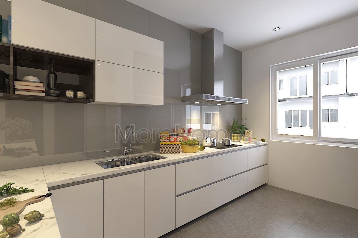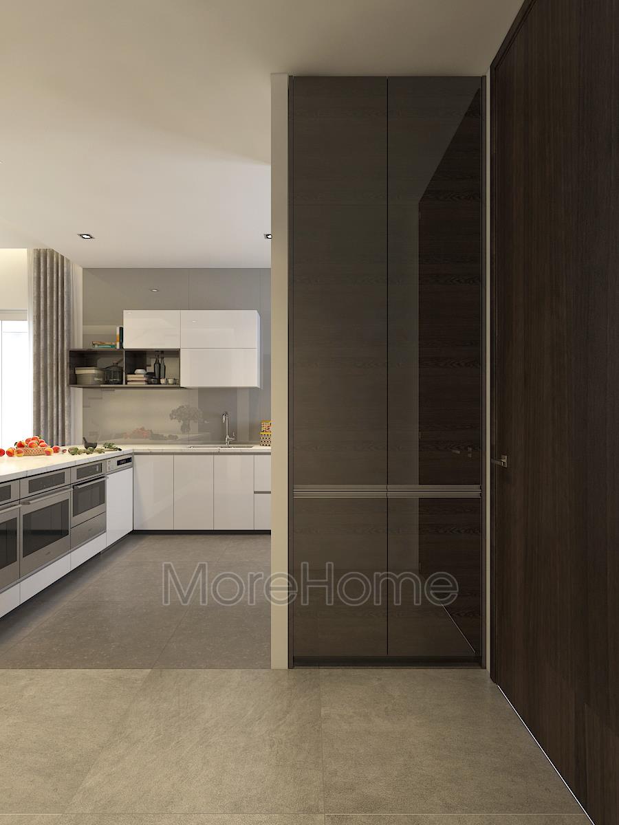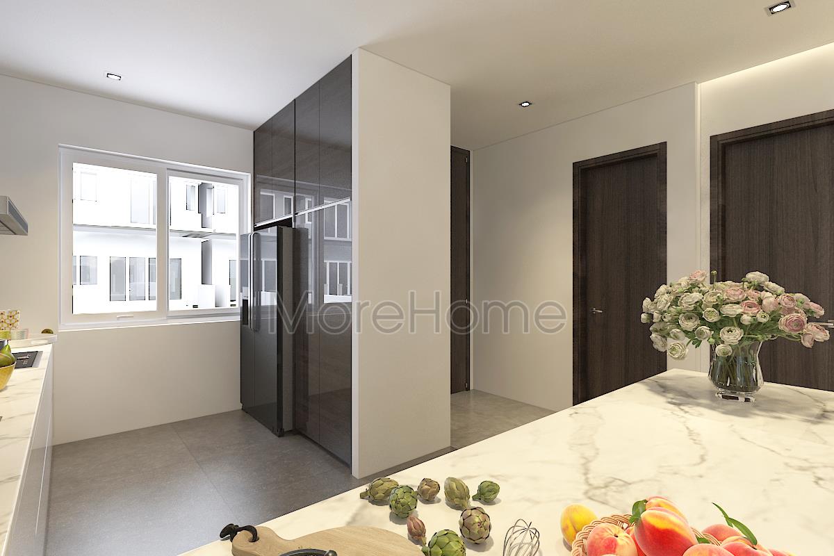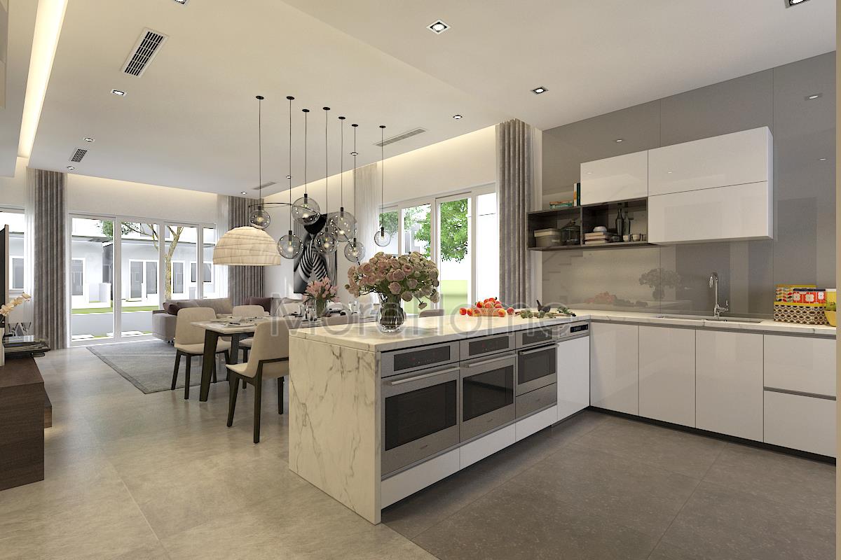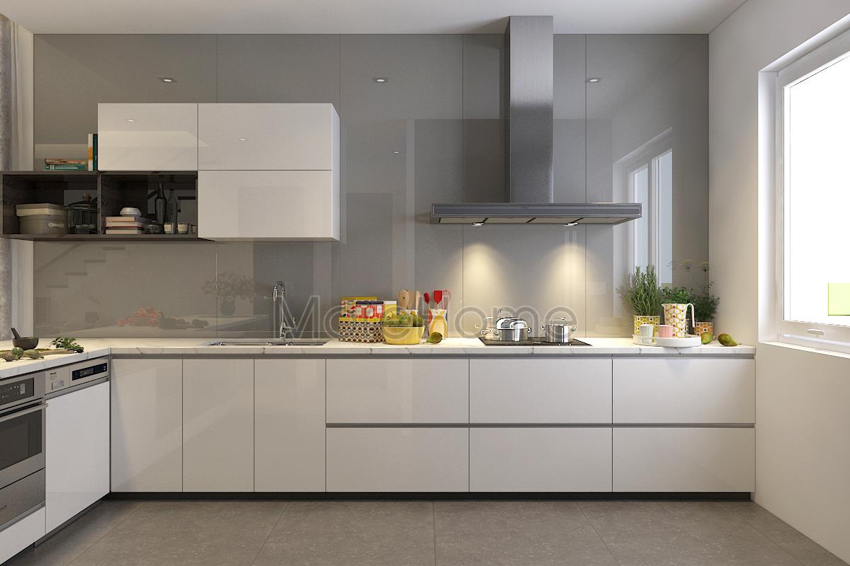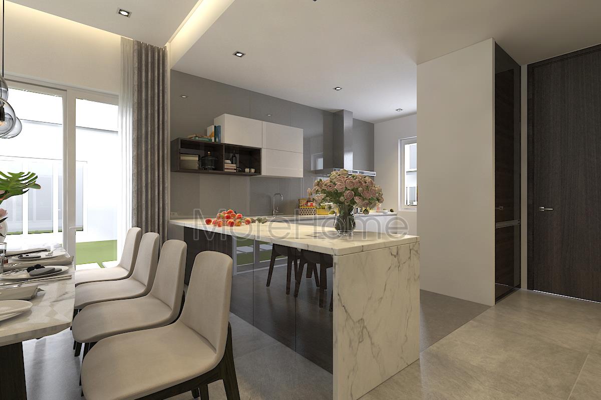 Tiếp đến là khu vực bếp, được thiết kế với chiếc bàn bếp dài hình chữ L mặt bàn được làm bằng đá tự nhiên màu trắng tạo nên sự tinh tế cho không gian bếp. Mẫu tủ bếp được sử dụng ở đây là tủ bếp Acrylic màu trắng kết hợp với đá ốp bếp màu bóng màu lông chuột tạo nên một không gian bếp thật thông thoáng và tươi mới. Một mảng tường khác được thiết kế với bộ tủ âm tường và một chiếc tủ lạnh cùng màu tạo nên sự hiện đại và đa năng nhất định cho người nội trợ.