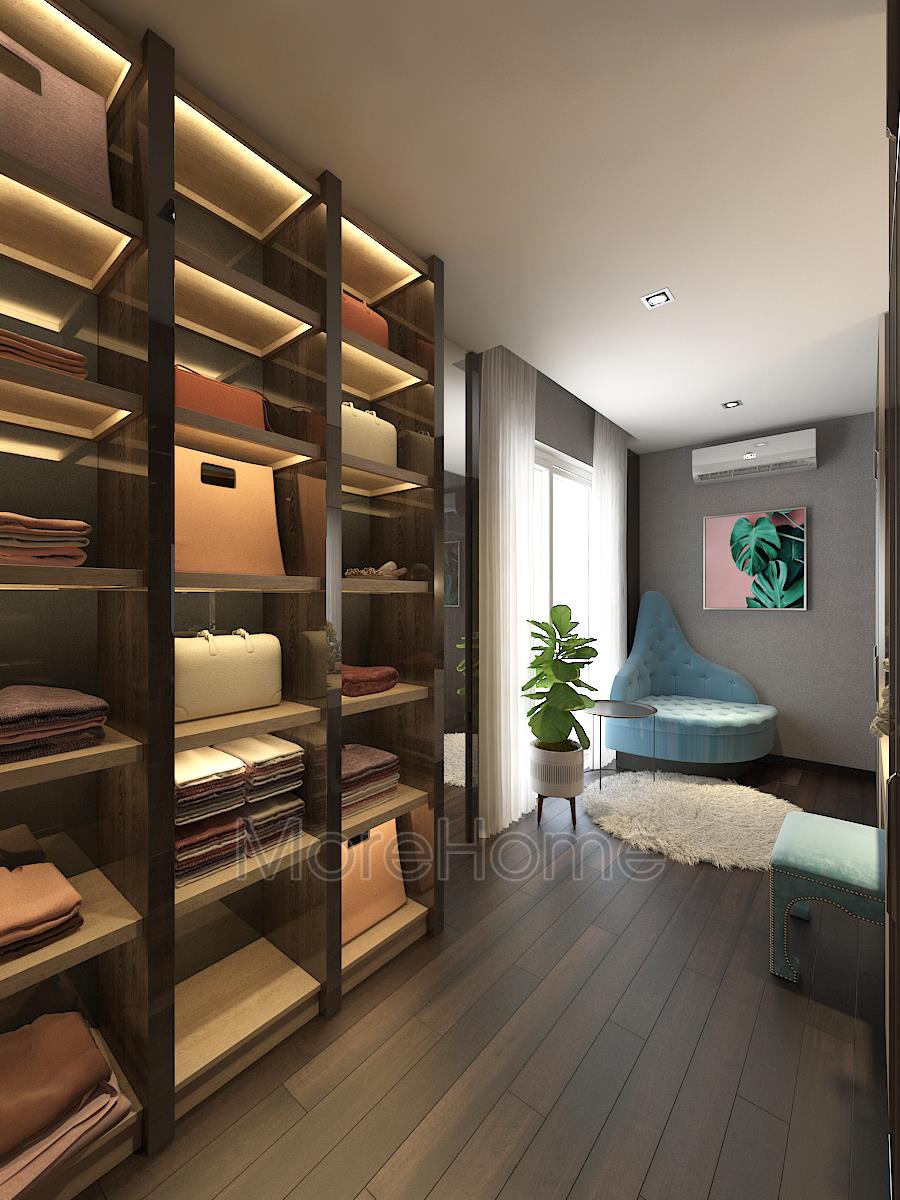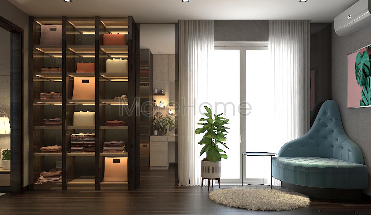 Đi sâu hơn trong phòng ngủ là phòng chứa đồ, với mẫu tủ quần áo được ốp kính sang trọng và đẳng cấp. Chiếc bàn trang đểm được đặt ở giữa 2 chiếc tủ tạo nên sự gọn gàng trong căn phòng. Một góc phòng ngủ được đặt một chiếc sofa khá cá tính bên cạnh cửa sổ giúp gia chủ có không gian đọc sách, thư giãn thoải mái nhất.