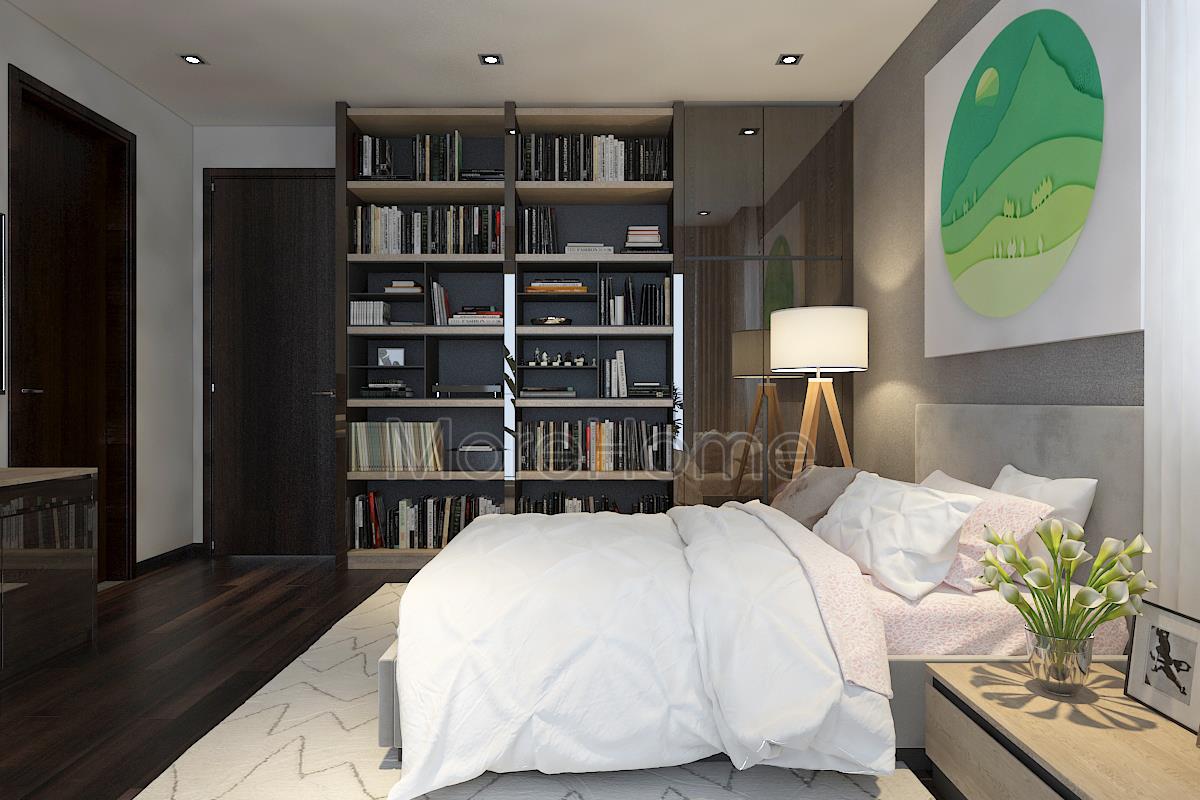 Phòng ngủ được thiết kế hoàn toàn ở trên tầng , những không gian phòng ngủ với đồ nội thất cùng tông màu với không gian tầng 1. Nội thất phòng ngủ được thiết kế khá đơn giản với chiếc giường hình chữ nhật, đối diện là vách ngăn gỗ kính tạo không gian riêng tư cho phòng ngủ với phòng tắm. bên trong phòng ngủ được thiết kế một không gian phòng nhỏ để gia chủ đọc sách hay làm việc.