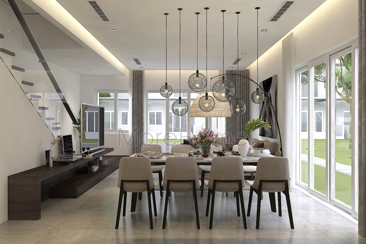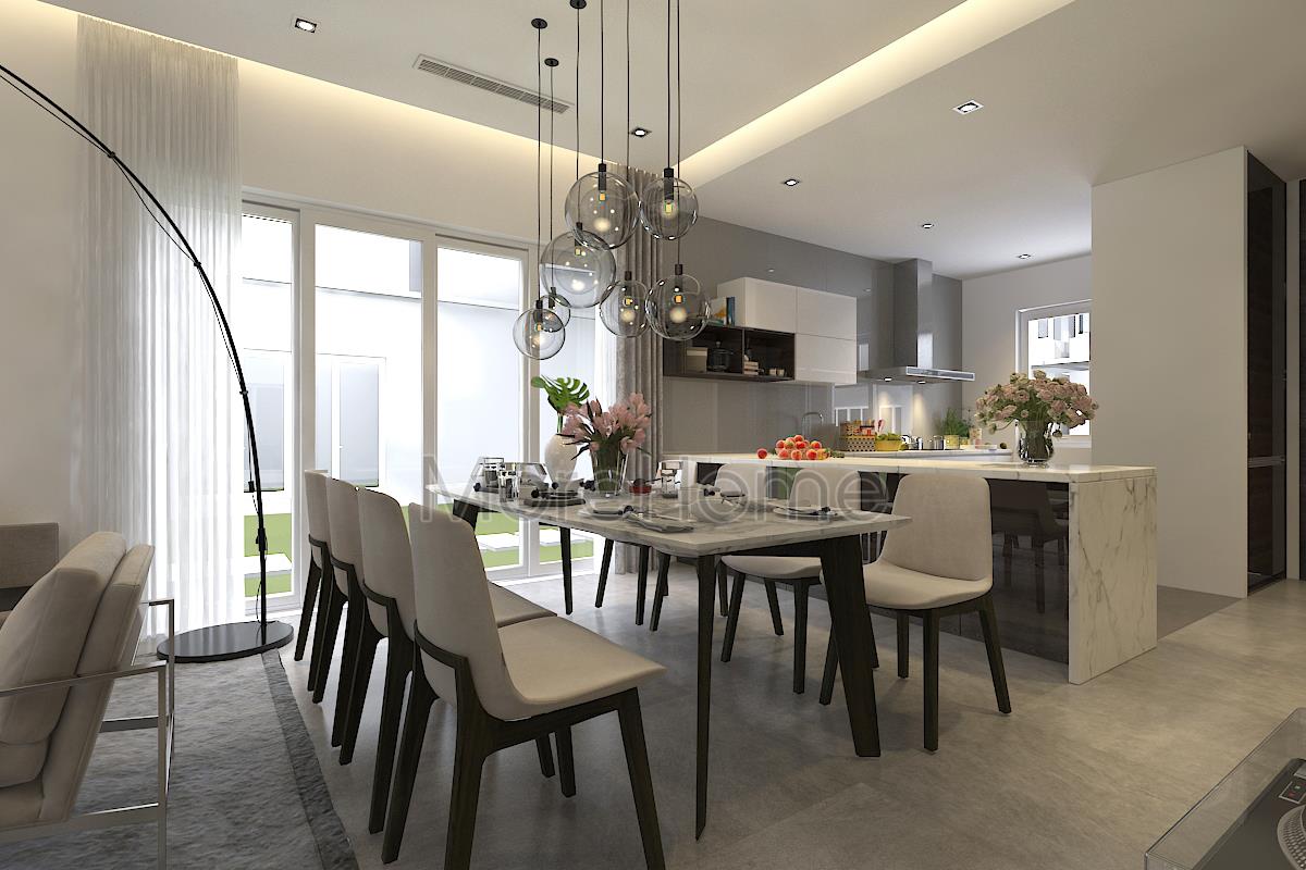 Thiết kế phòng bếp, ăn liên thông với phòng khách giúp cho khu vực tầng 1 thật hiện đại, tiện nghi. Bên cạnh bộ sofa là bộ bàn ăn 8 ghế chân gỗ và mẫu đèn thả hình tròn to nhỏ được đặt bên cạnh của sổ tạo nên một không gian ăn uống thật ấm cúng, sang trọng.