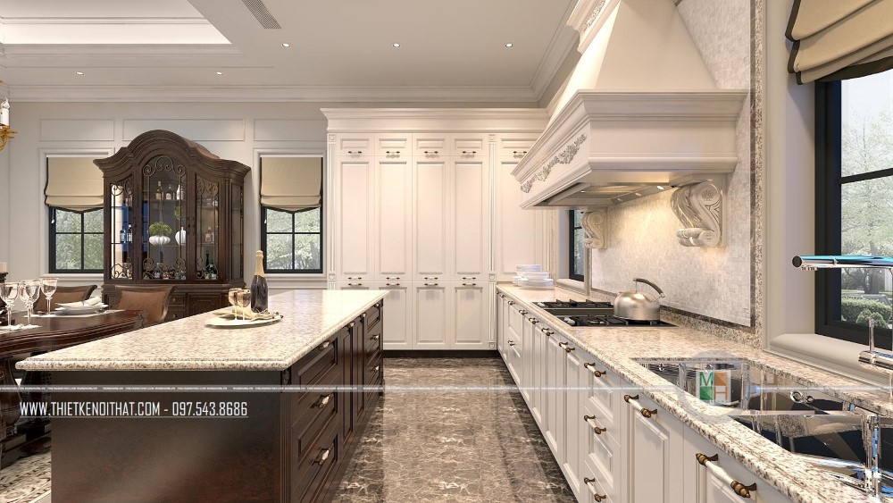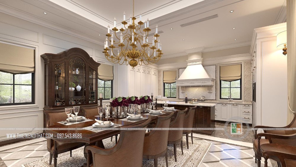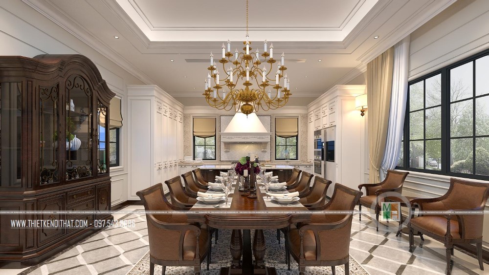 Vì không muốn thiết kế phòng khách và phòng ăn liền kề nhau nên khi đến đây, từ phòng khách bạn phải đi ra phía hành lang 1 đoạn ngắn để đến phòng khách được nằm yên tĩnh, kín đáo tại 1 góc trong. Phòng ăn và phòng bếp liền kề nhau được thiết kế thật lung linh và rực rỡ. Tại đây, hầu hết nội thất đều được làm từ gỗ tự nhiên cao cấp, toát lên vẻ đẹp đẳng cấp, thời thượng. Trong đó, tương phản với màu trắng sứ của hệ thống tủ bếp là kệ tủ và bàn ghế ăn màu nâu sang chảnh. Ngoài chiếc bàn ăn bằng gỗ với 4 chiếc ghế bành lớn 2 bên và bàn ăn hình bầu dục lượn cong ở các góc thì ở 1 góc tường cạnh đó, gia chủ còn lắp đặt 1 bộ bàn ghế nữa với chiếc bàn nhỏ và 2 ghế bành 2 bên, rất tiện lợi trong sinh hoạt.