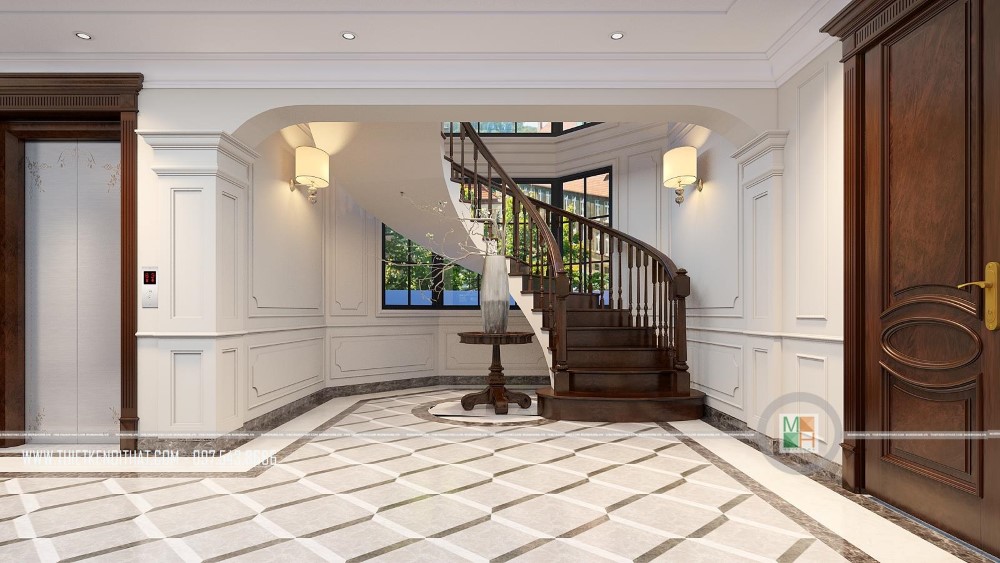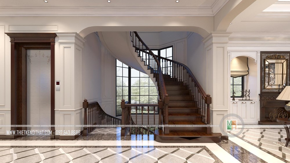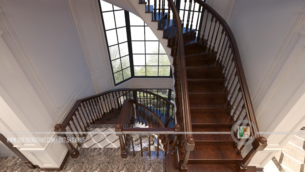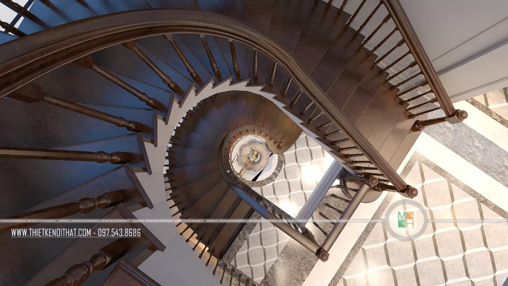 Nhìn từ trên xuống dưới, chiếc cầu thang gỗ hình xoắn ốc mới thật đẹp và thơ mộng làm sao. Nó vừa có tác dụng nâng đỡ mỗi bước chân người đi, là cầu nối lưu thông giữa các phòng, đồng thời còn là điểm nhấn tăng sự sống động cho toàn bộ căn biệt thự. Ngoài chiếc cầu thang này, gia chủ còn lắp đặt cầu thang máy để phục vụ cho nhu cầu sinh hoạt và đi lại tiện lợi hơn.