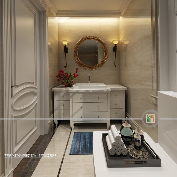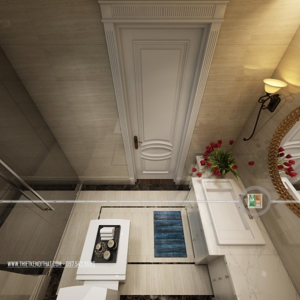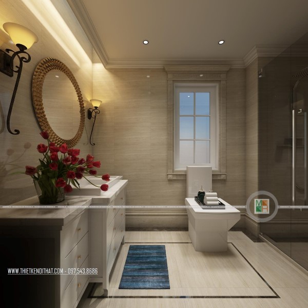 Nói đến phòng vệ sinh của căn biệt thự là nói đến sự cầu kì trong từng chi tiết của các mẫu nội thất. Từ hệ thống đèn, bồn tắm đến gương soi, bồn rửa mặt, tủ kệ đựng đồ đều có vẻ đẹp lung linh đến hoàn hảo. Gia chủ chắc hẳn cũng là người yêu thiên nhiên khi đã trang trí cả cây xanh và hoa tươi trong không gian này, khiến phòng tắm đã lung linh lại càng thêm lãng mạn. Bên cạnh đó, để tạo sự sạch sẽ, khô thoáng và pha chút hiện đại cho phòng tắm, gia chủ đã chọn phương án lắp đặt vách tắm kính.