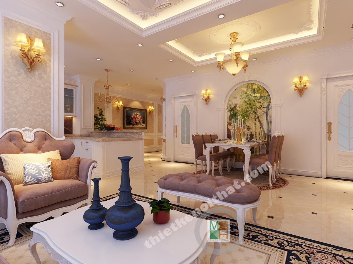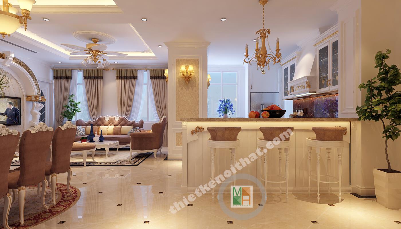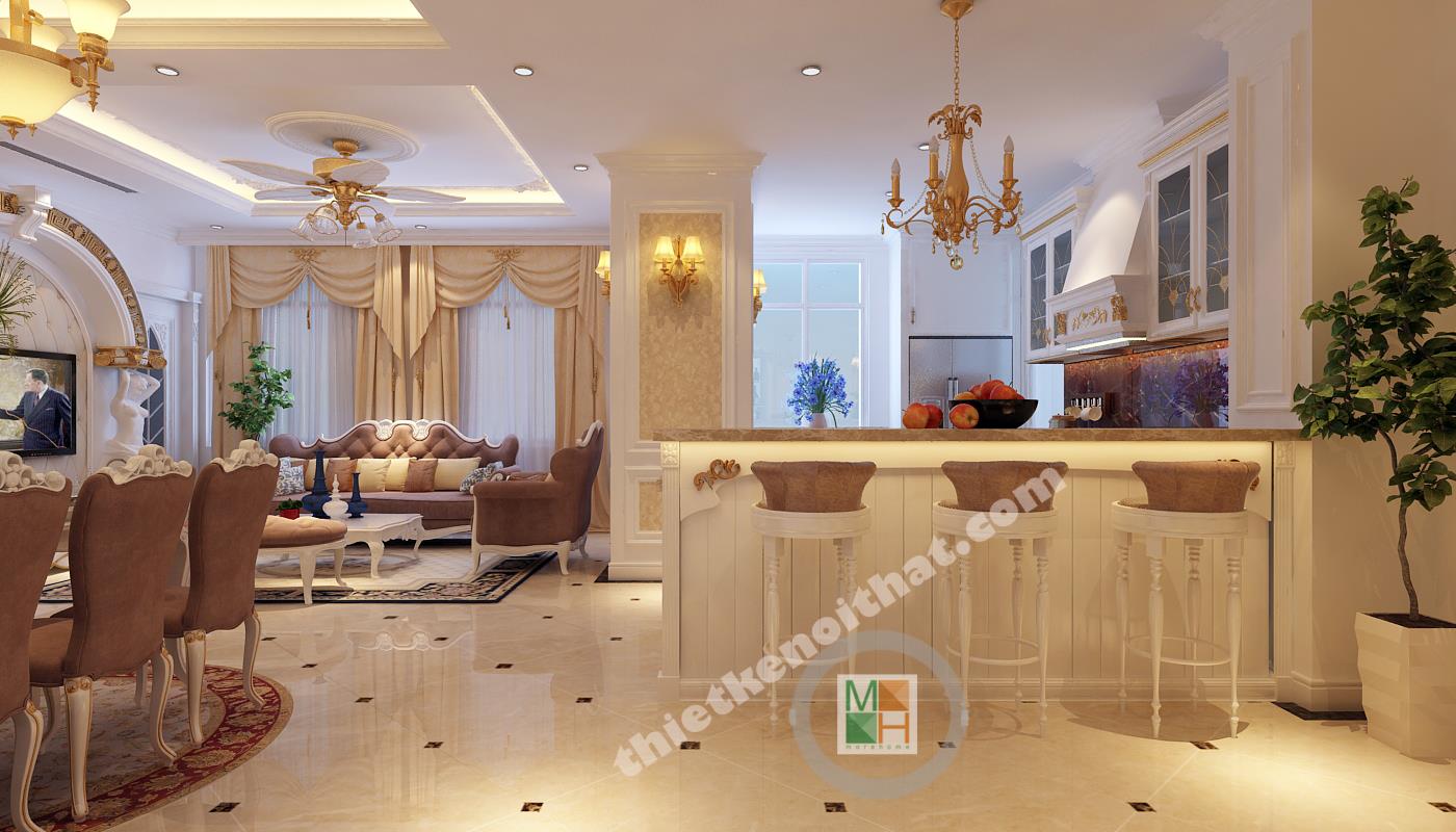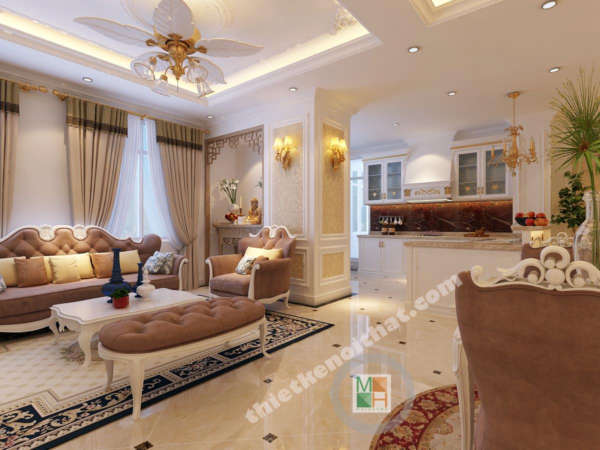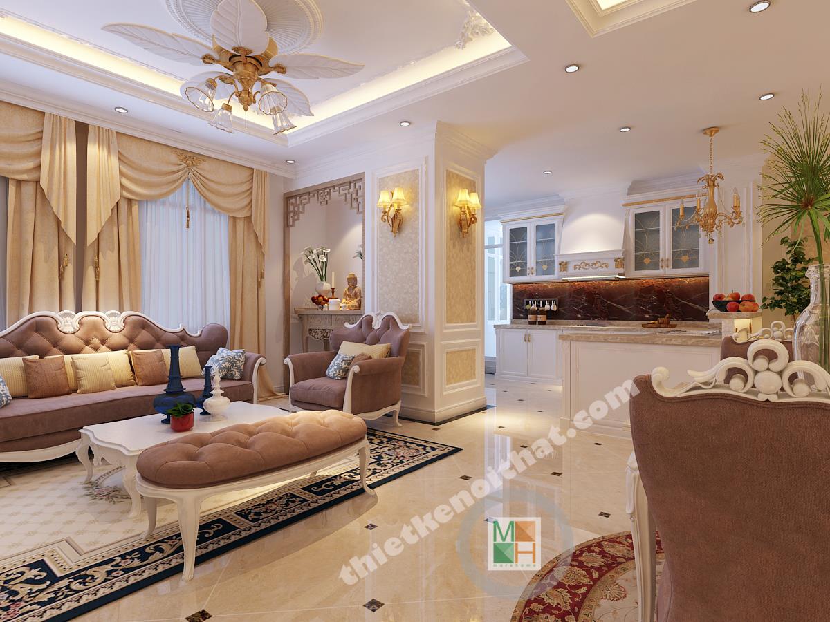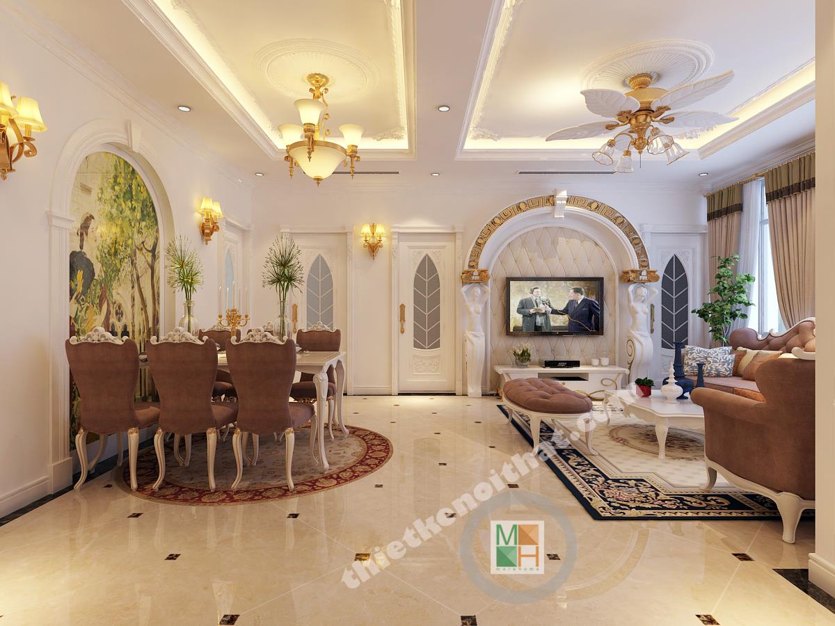 Gian phòng lớn là không gian sinh hoạt chung gồm phòng khách, bếp và bàn ăn. Cách sắp xếp gần nhau như vậy làm cho các thành viên trong gia đình trở nên gần tường sau tivi. Thiết kế hình cổng vòm là đặc trưng của những công trình phương Tây nên việc kết hợp nó trong một không gian nhỏ đem lại cảm giác vương giả, sang trọng. Bộ sofa mang nhiều đường nét và họa tiết cổ điển nhưng không tràn lan mà tinh tế, nhấn nhá vào từng góc cạnh. Hai ô cửa sổ ở bên hông phòng giúp không gian trở nên thoáng và tạo hiệu ứng ánh sáng lên các chi tiết sơn vàng bóng. Kế bên phòng khách là bàn ăn với cách trang trí bằng tranh độc đáo. Bức tường bên cạnh được dán một bức tranh khổ lớn màu sắc nhằm tạo nên không khí tươi vui cho bữa ăn. Ngoài ra đèn gắn tường và đèn chùm nhỏ giúp mang đến cảm giác ấm cúng cho không gian. Căn bếp được bố trí hợp lí từ các thiết bị đến những đường nét thiết kế. Vách ngăn lửng được tận dụng thông minh thành một quầy bar nhỏ nên gia chủ có thể ngồi thưởng rượu cùng người thân. Phần tường nối ở bếp được gắn một lớp kính để tiện cho việc lau chùi và trông cũng đẹp mắt hơn. Phần tủ và hút mùi tạo điểm nhấn với những hoa văn sơn vàng cổ điển. Phần trống dưới bệ cửa sổ có thể tận dụng để đặt những chiếc máy giặt nhỏ và trang trí bằng một lọ hoa xinh xắn phía trên.