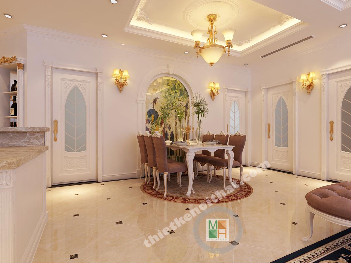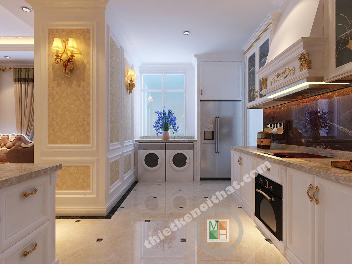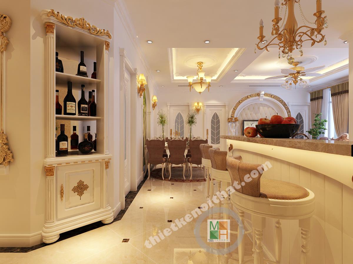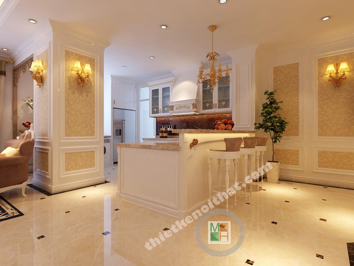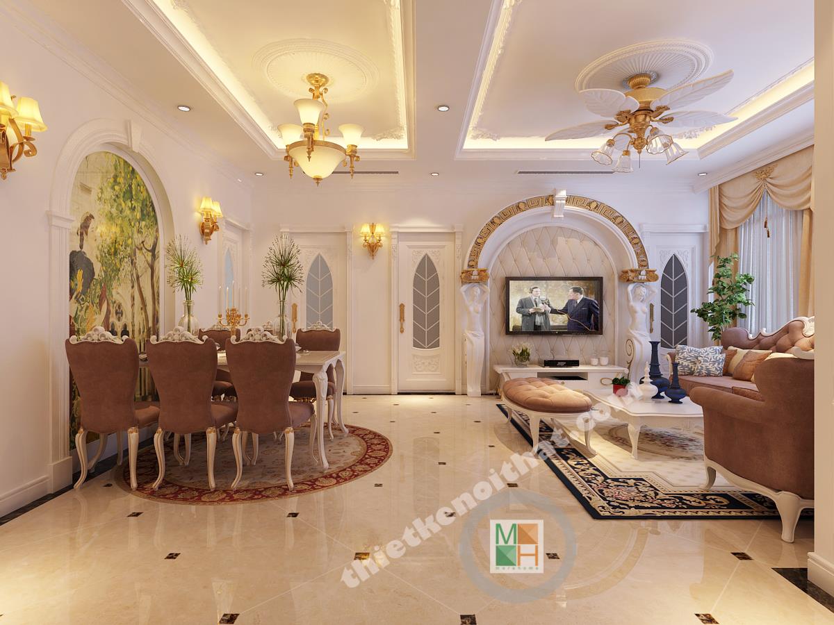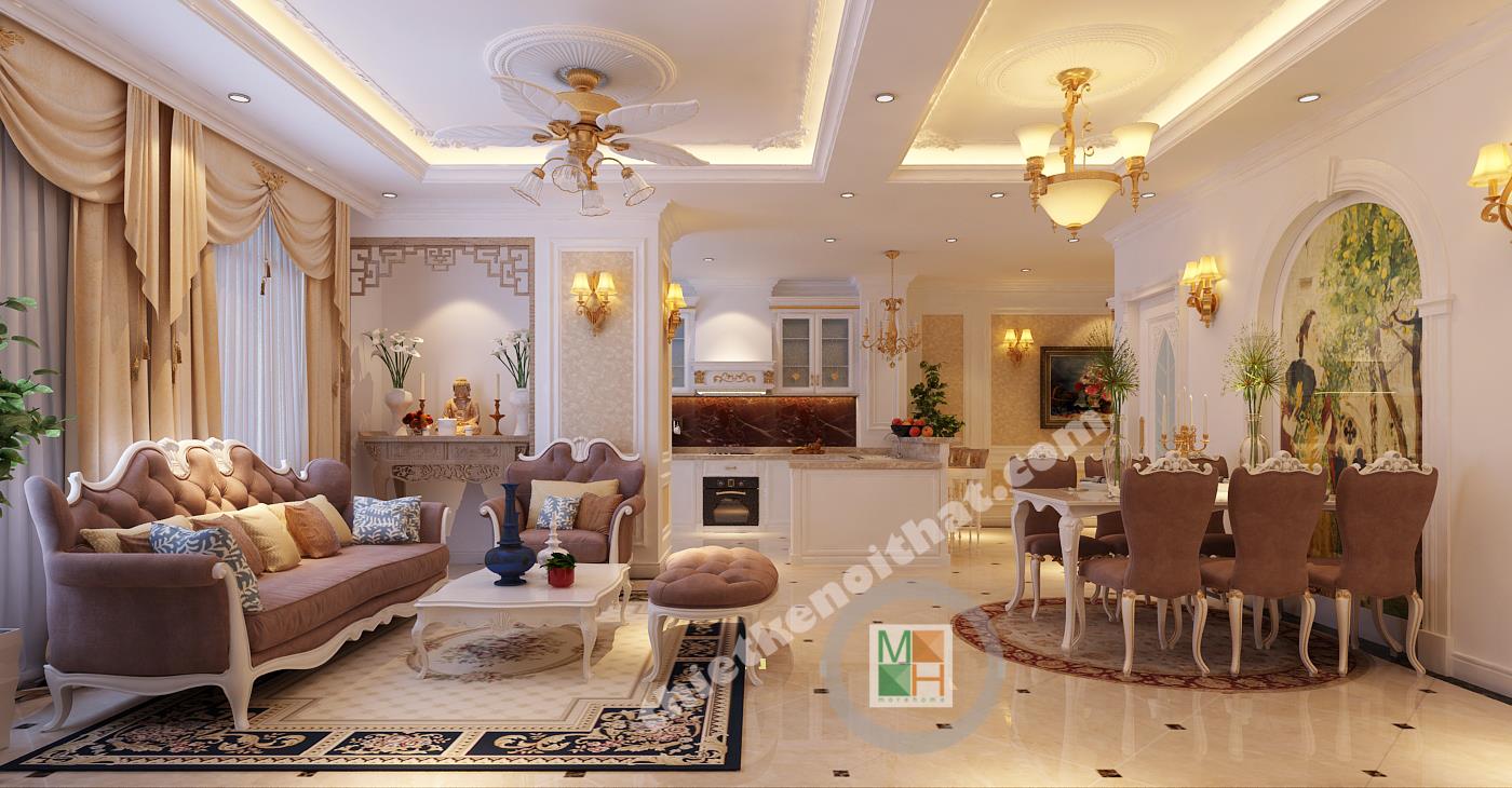 Gian phòng lớn là không gian sinh hoạt chung gồm phòng khách, bếp và bàn ăn. Cách sắp xếp gần nhau như vậy làm cho các thành viên trong gia đình trở nên gần tường sau tivi. Thiết kế hình cổng vòm là đặc trưng của những công trình phương Tây nên việc kết hợp nó trong một không gian nhỏ đem lại cảm giác vương giả, sang trọng. Bộ sofa mang nhiều đường nét và họa tiết cổ điển nhưng không tràn lan mà tinh tế, nhấn nhá vào từng góc cạnh. Hai ô cửa sổ ở bên hông phòng giúp không gian trở nên thoáng và tạo hiệu ứng ánh sáng lên các chi tiết sơn vàng bóng. Kế bên phòng khách là bàn ăn với cách trang trí bằng tranh độc đáo. Bức tường bên cạnh được dán một bức tranh khổ lớn màu sắc nhằm tạo nên không khí tươi vui cho bữa ăn. Ngoài ra đèn gắn tường và đèn chùm nhỏ giúp mang đến cảm giác ấm cúng cho không gian. Căn bếp được bố trí hợp lí từ các thiết bị đến những đường nét thiết kế. Vách ngăn lửng được tận dụng thông minh thành một quầy bar nhỏ nên gia chủ có thể ngồi thưởng rượu cùng người thân. Phần tường nối ở bếp được gắn một lớp kính để tiện cho việc lau chùi và trông cũng đẹp mắt hơn. Phần tủ và hút mùi tạo điểm nhấn với những hoa văn sơn vàng cổ điển. Phần trống dưới bệ cửa sổ có thể tận dụng để đặt những chiếc máy giặt nhỏ và trang trí bằng một lọ hoa xinh xắn phía trên.