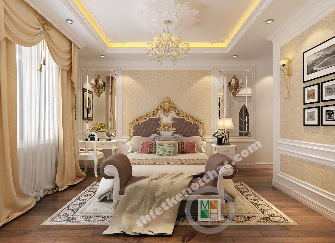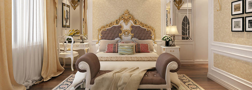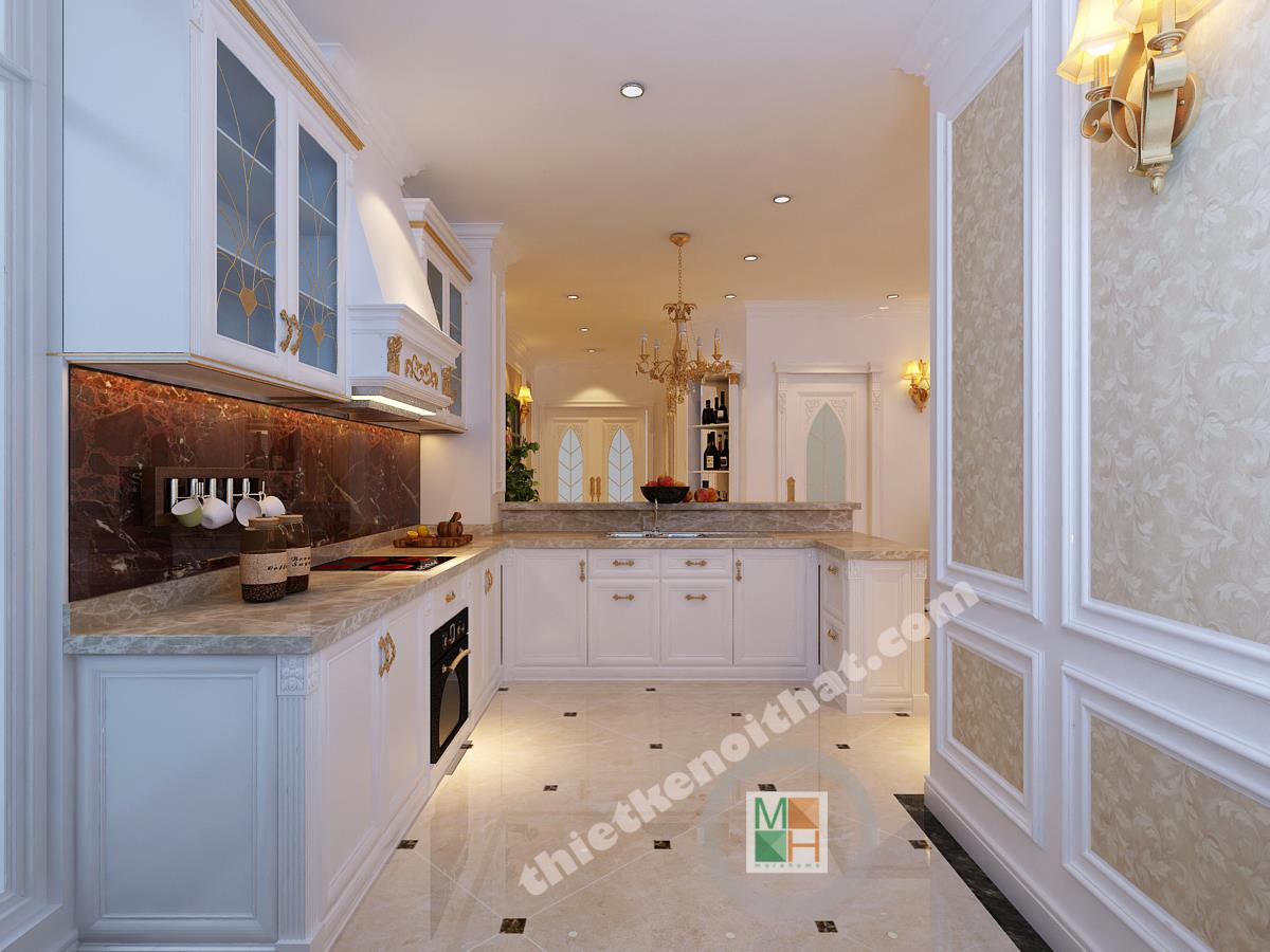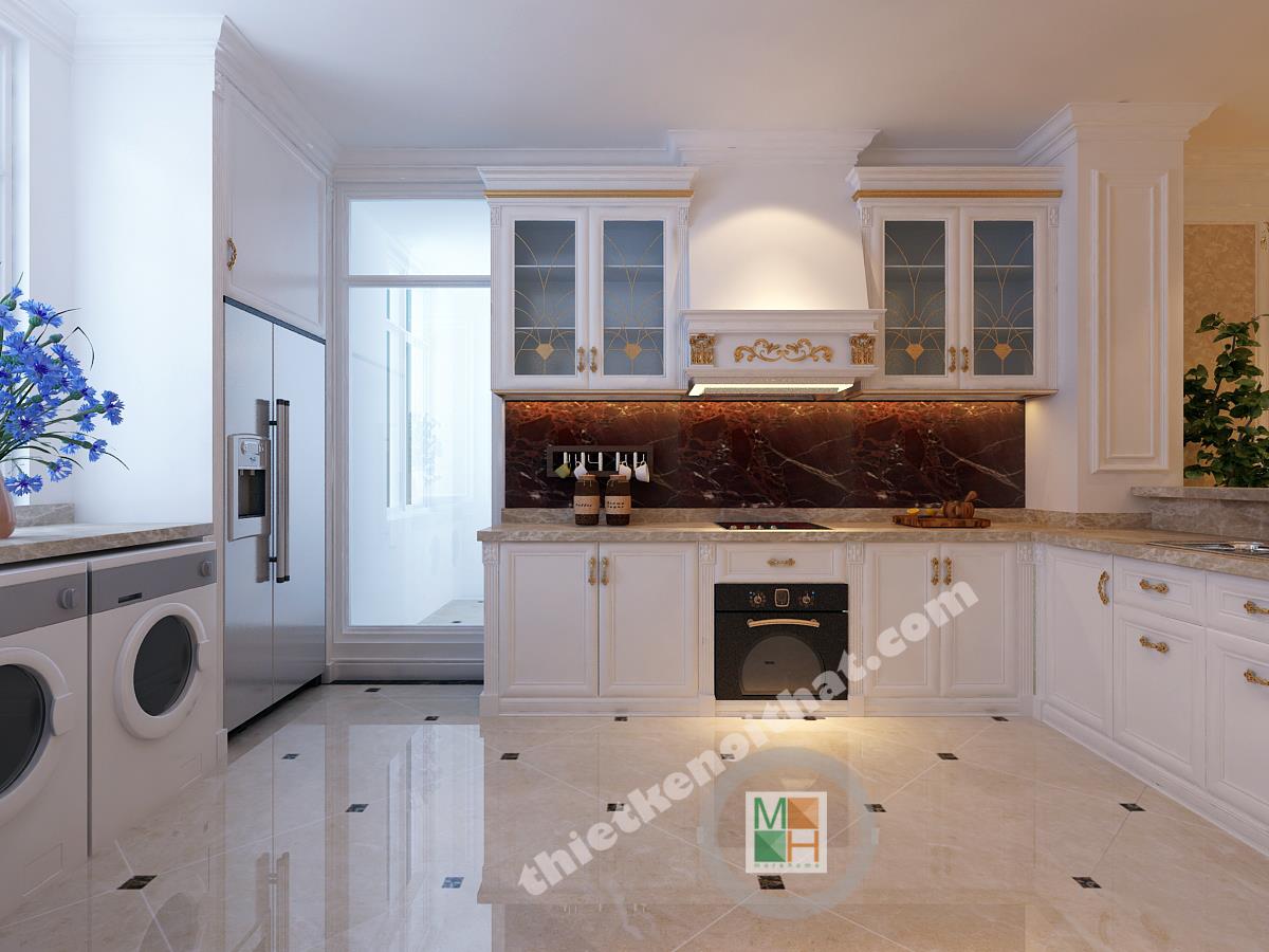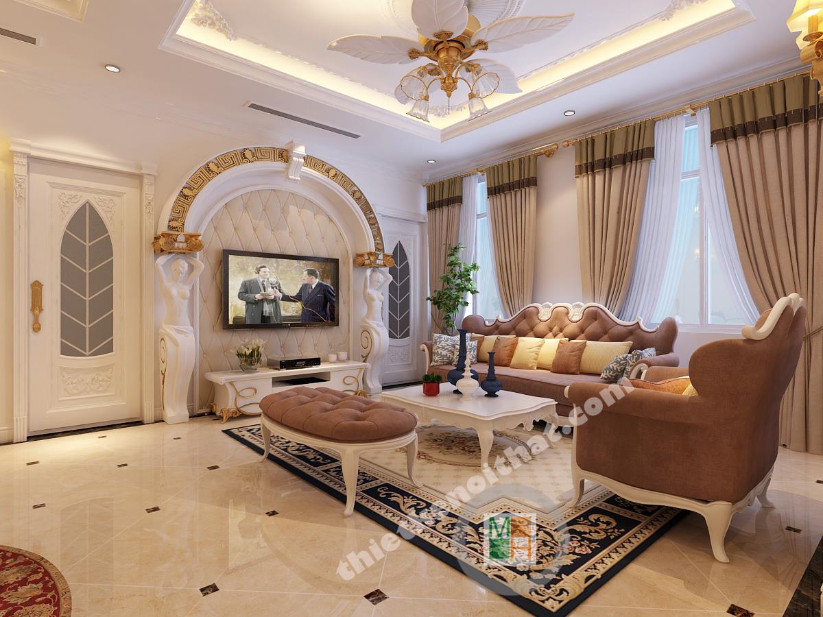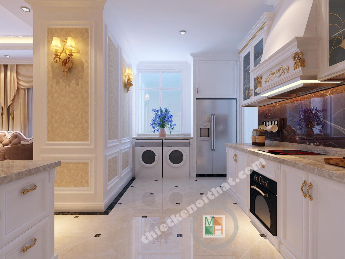Gian phòng lớn là không gian sinh hoạt chung gồm phòng khách, bếp và bàn ăn. Cách sắp xếp gần nhau như vậy làm cho các thành viên trong gia đình trở nên gần tường sau tivi. Thiết kế hình cổng vòm là đặc trưng của những công trình phương Tây nên việc kết hợp nó trong một không gian nhỏ đem lại cảm giác vương giả, sang trọng. Bộ sofa mang nhiều đường nét và họa tiết cổ điển nhưng không tràn lan mà tinh tế, nhấn nhá vào từng góc cạnh. Hai ô cửa sổ ở bên hông phòng giúp không gian trở nên thoáng và tạo hiệu ứng ánh sáng lên các chi tiết sơn vàng bóng. Kế bên phòng khách là bàn ăn với cách trang trí bằng tranh độc đáo. Bức tường bên cạnh được dán một bức tranh khổ lớn màu sắc nhằm tạo nên không khí tươi vui cho bữa ăn. Ngoài ra đèn gắn tường và đèn chùm nhỏ giúp mang đến cảm giác ấm cúng cho không gian. Căn bếp được bố trí hợp lí từ các thiết bị đến những đường nét thiết kế. Vách ngăn lửng được tận dụng thông minh thành một quầy bar nhỏ nên gia chủ có thể ngồi thưởng rượu cùng người thân. Phần tường nối ở bếp được gắn một lớp kính để tiện cho việc lau chùi và trông cũng đẹp mắt hơn. Phần tủ và hút mùi tạo điểm nhấn với những hoa văn sơn vàng cổ điển. Phần trống dưới bệ cửa sổ có thể tận dụng để đặt những chiếc máy giặt nhỏ và trang trí bằng một lọ hoa xinh xắn phía trên.
