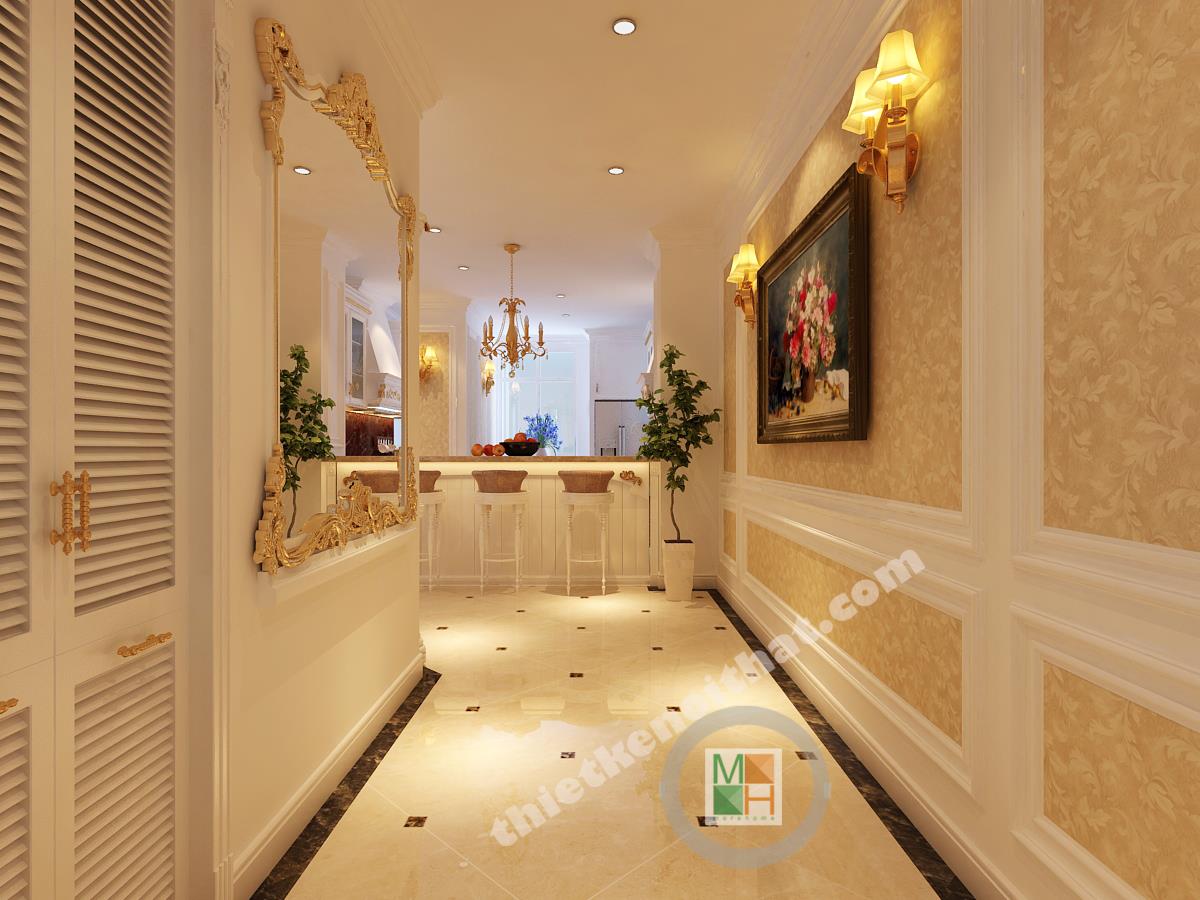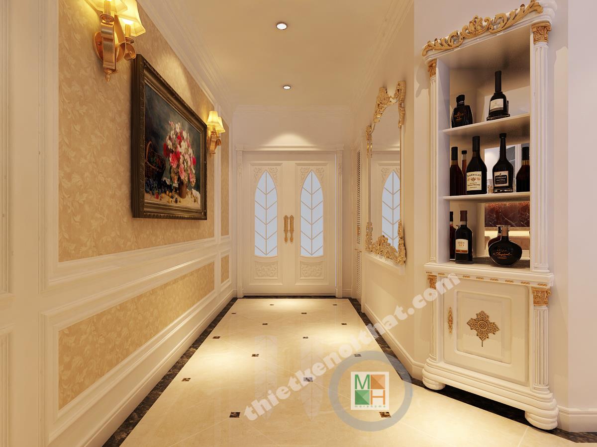Căn hộ được thiết kế theo phong cách tân cổ điển, không cần nhiều chi tiết rườm rà mà vẫn nhẹ nhàng, sang trọng. Vật liệu chính được sử dụng là gỗ tự nhiên với sơn trắng phủ bóng, vừa sạch sẽ trong sử dụng, vừa mới mẻ trong chất liệu. Khoảng đệm dẫn từ cửa vào sử dụng ánh sáng vàng ấm từ đèn tường như một cách để chào mời khách đến chơi nhà. Tủ rượu được đặt ở một bên tường giúp gia chủ có thể trưng bày những chai rượu quý của mình với bạn bè.