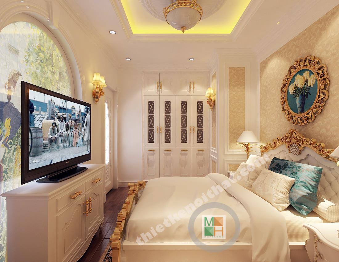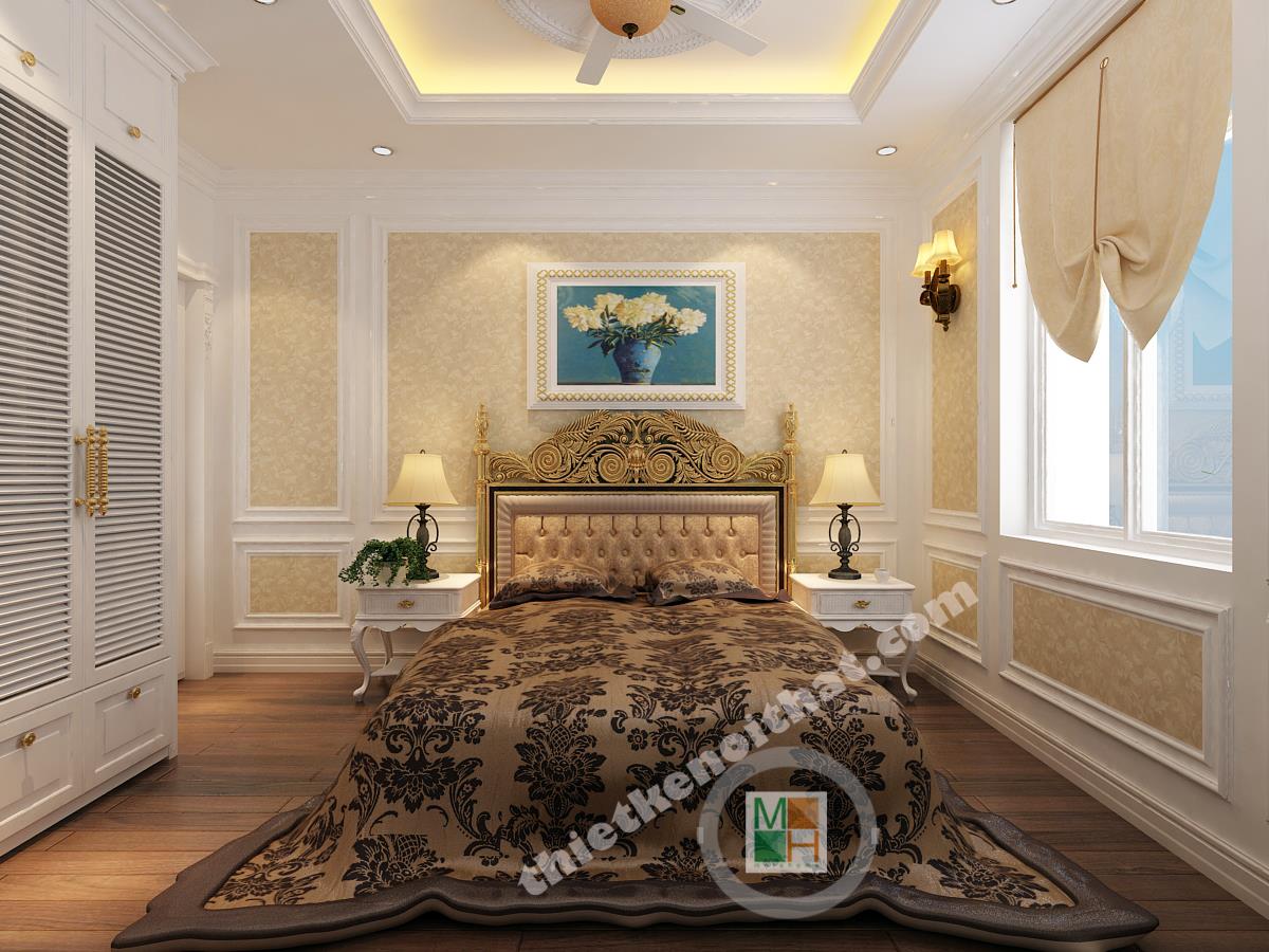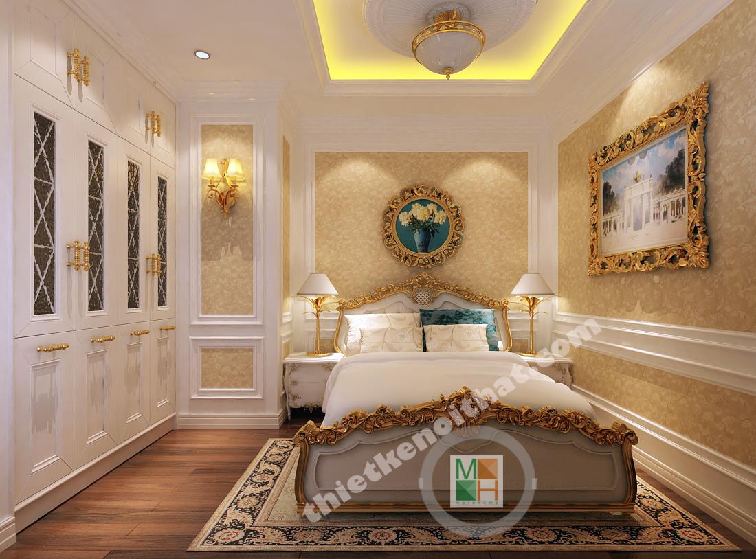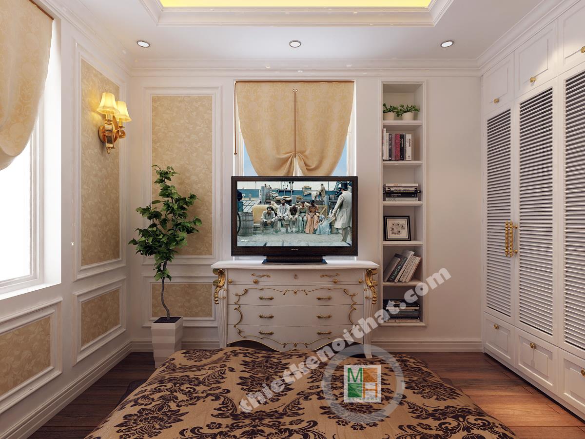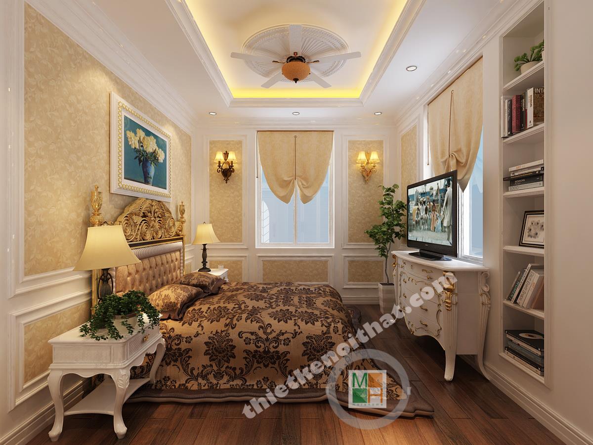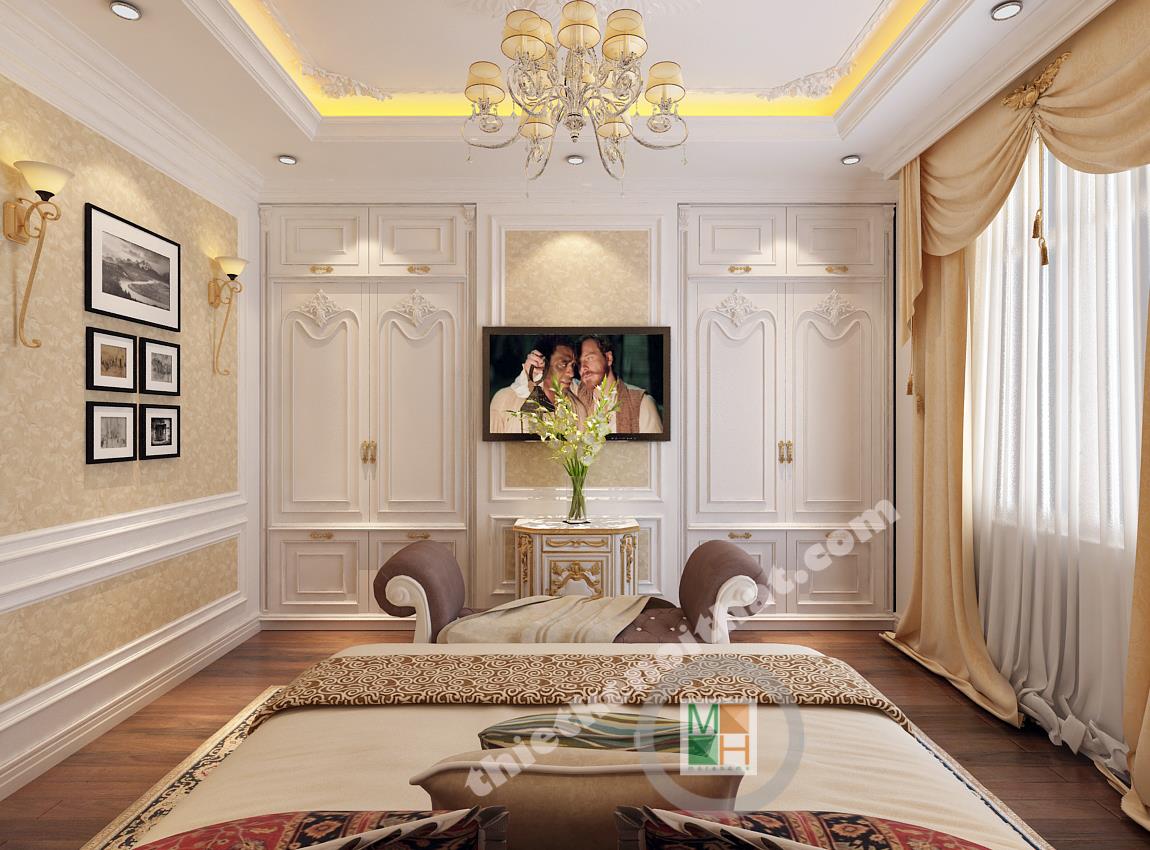Phòng ngủ master với thiết kế đối xứng độc đáo nhưng cũng rất trẻ trung, duyên dáng. Hai chiếc tủ quần áo bố trí hai bên tivi tạo ra trọng tâm cho căn phòng. Gương dài ở hai bên giường vừa có tác dụng trang trí lại giúp ánh sáng từ đèn trần và ngoài cửa sổ hắt vào trở nên lung linh và lãng mạn hơn. Phần tường trống được tô điểm bằng những bức ảnh gia đình nhỏ, tạo không khí vui tươi, đầm ấm.
