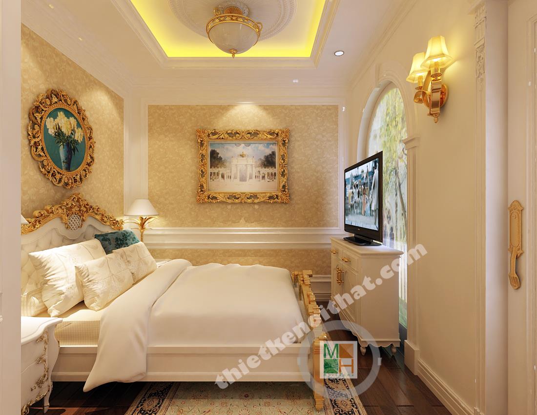 Phòng ngủ của bà có diện tích khiêm tốn nhưng nhờ cách bố trí ánh sáng và màu sắc nên không gian vẫn rất sang trọng và ấm cúng. Những chi tiết sơn vàng như khung tranh, mép giường hay tay nắm tủ đều làm tăng sự tinh tế và quý phái cho căn phòng. Điểm nhấn của căn phòng là bức tranh kính ở phía sau tivi. Bức tranh tạo ra chiều sâu cho căn phòng và làm mảng tường không bị nhàm chán.