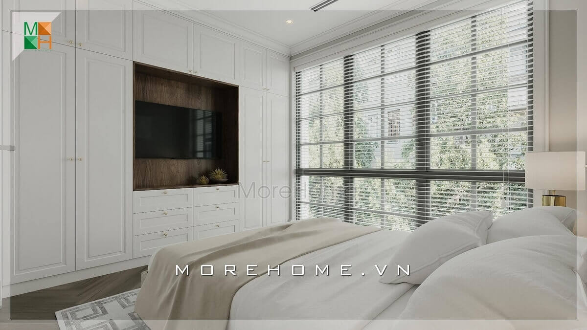 Thiết kế phòng ngủ đơn giản nhưng tiện nghi với hệ thống tủ âm tường hiện đại đem lại cảm giác thoáng đãng và cao cấp cho không gian nhà phố.