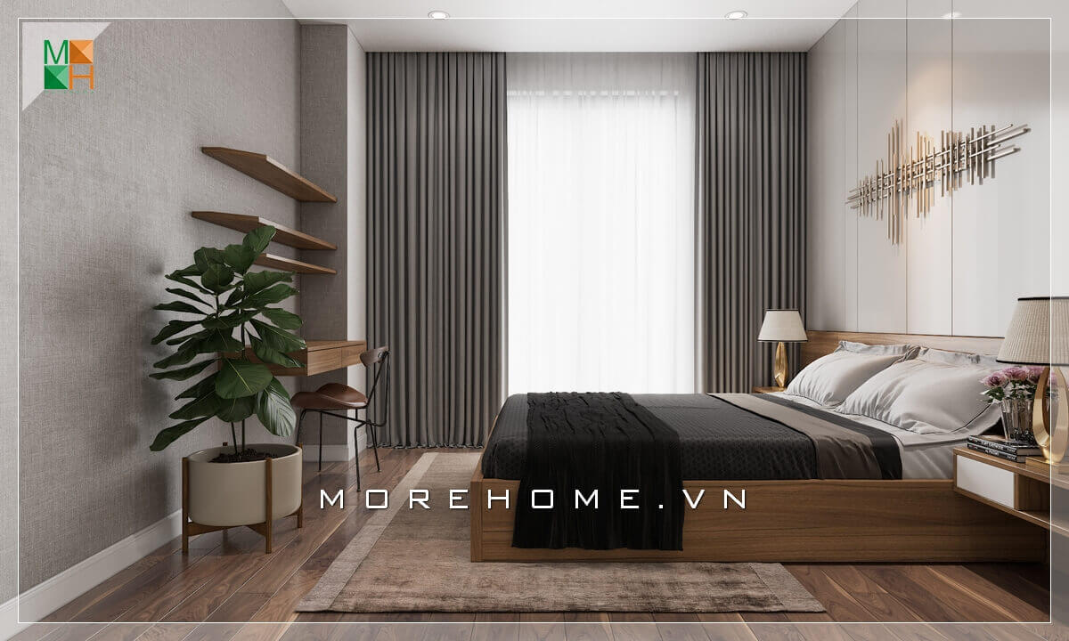 Trang trí nội thất phòng ngủ ấn tượng với hệ cửa lớn cùng rèm 2 lớp vừa tận dụng tối đa ánh sáng tự nhiên nhưng vẫn giúp căn phòng chống lại sức nóng oi ả ngày hè hiệu quả.