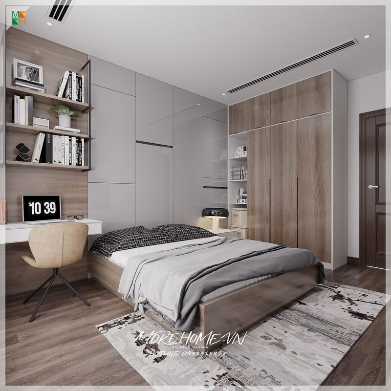 Mẫu giường ngủ hiện đại là điểm nhấn căn phòng ngủ được đặt giữa không gian phòng cùng tone màu trắng chủ đạo rất tinh tế.