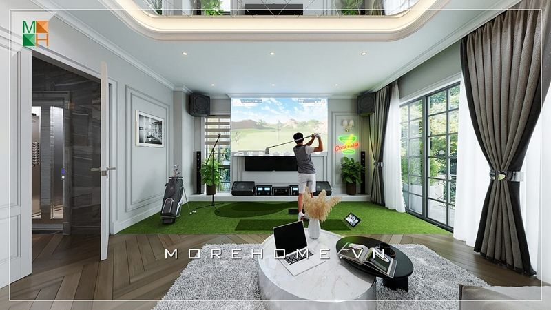 Thiết kế nội thất biệt thự đầy sáng tạo độc đáo khi bố trí sân golf nhỏ và vách kính ngăn thông thoáng hiện đại.