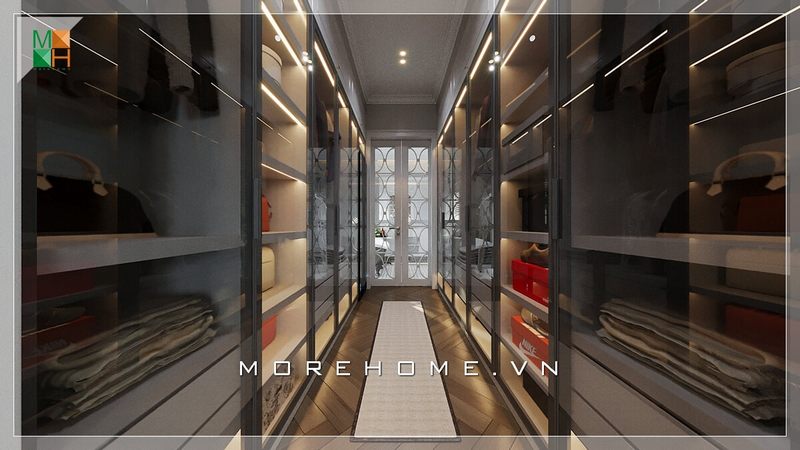 Ấn tượng với sự tiện lợi, hiện đại của thiết kế nội thất biệt thự có tủ quần áo lớn dài kết hợp gỗ và kính thuận tiện cho việc lựa chọn và sắp xếp.